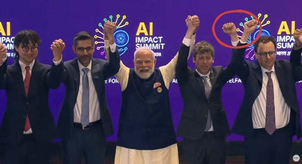 If you follow AI news, or general tech and business news, your timeline and inbox may likely be flooded soon with one image – a photo of Sam Altman and Dario Amodei refusing to hold hands on stage at the India AI Impact Summit in a kumbaya photo-op.