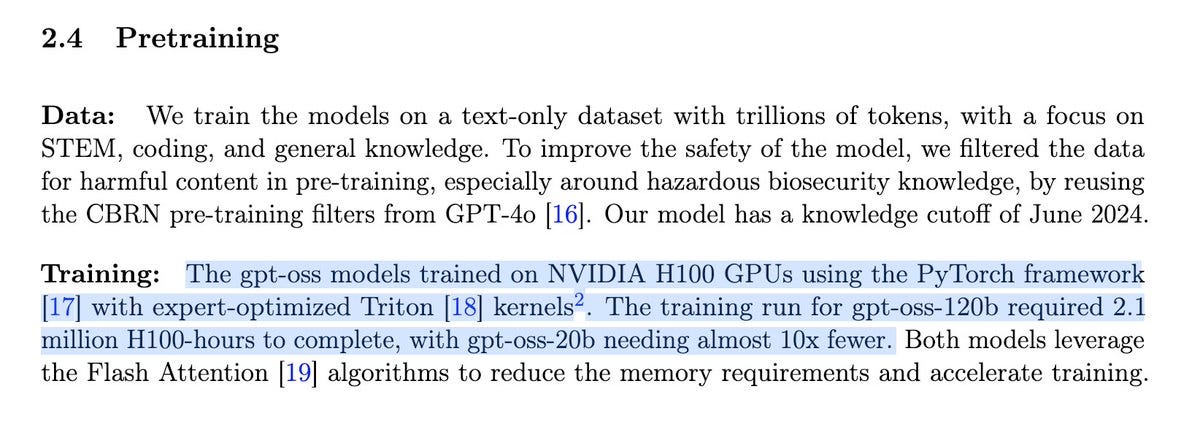 Funny enough, both models’ releases mimic each other even in the way they both mislead! One section of gpt-oss’s model card claims that the larger version of the model with 120 billion parameters only used 2.1 million H100 GPU hours to train. This claim is most certainly misleading, given all the resources that was spent up to the point of this final training run – misleading in the same way that DeepSeek was with its claim of only using 2.66 million H800 GPU hours to train R1, which sent Nvidia stock tumbling 17% in a single day!
